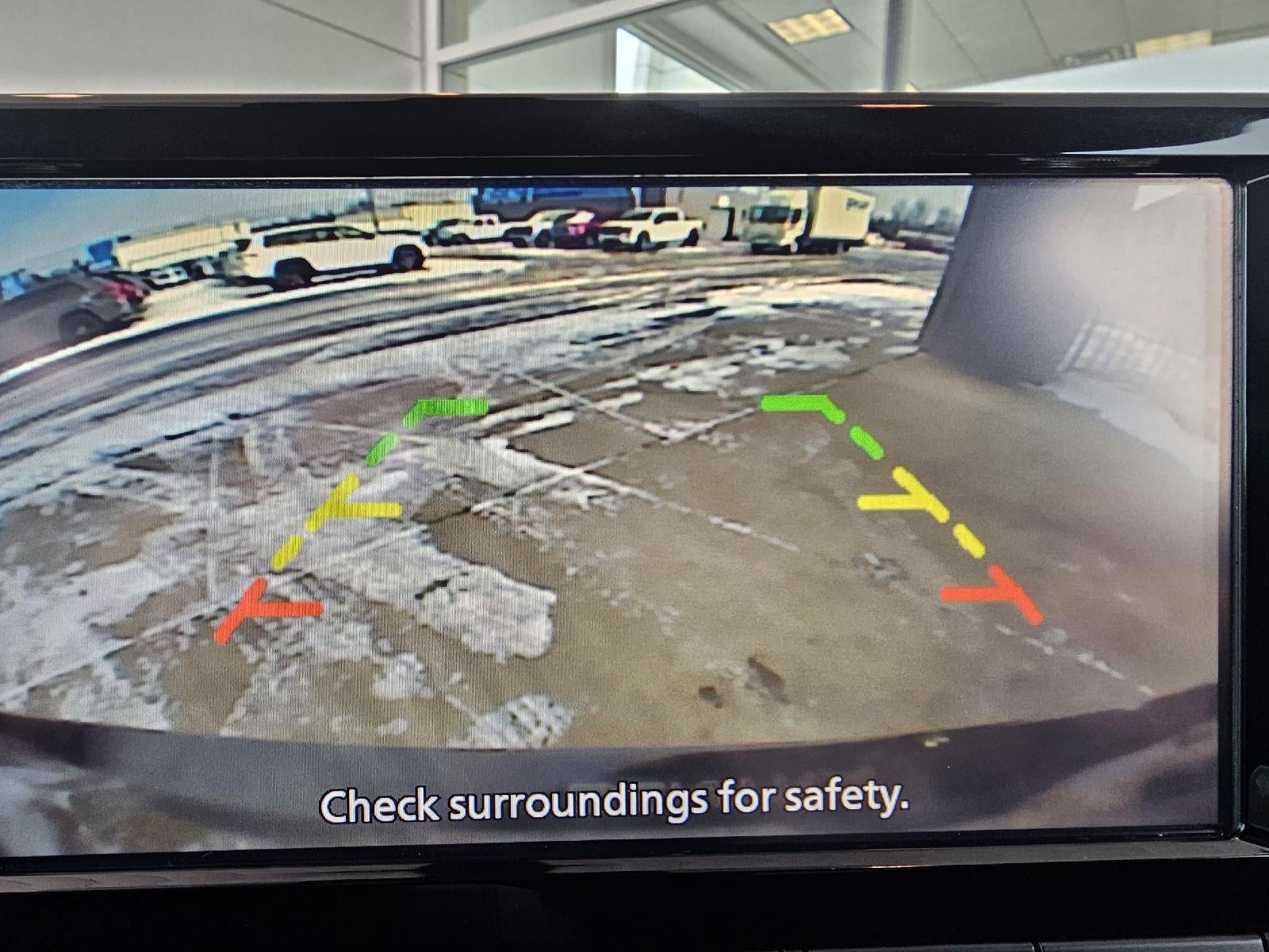 - The vehicle is equipped with a camera that displays an image of the area behind the vehicle on an interior display.